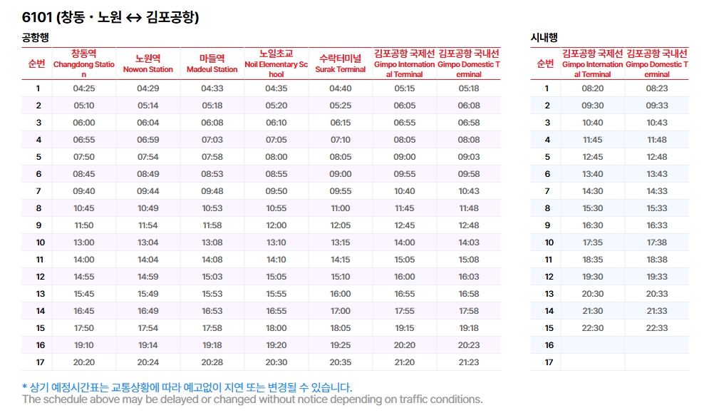 6101번은 창동역을 출발해 노원역, 마들역, 노일초교(노원초교), 수락터미널을 거쳐 김포공항까지 운행하는 공항버스입니다. 서울 동북권에서 김포공항까지 가는 교통수단 중에 빠르고 편리한 편입니다.