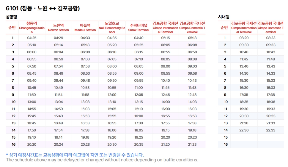 6101번은 창동역을 출발해 노원역, 마들역, 노일초교(노원초교), 수락터미널을 거쳐 김포공항까지 운행하는 공항버스입니다. 서울 동북권에서 김포공항까지 가는 빠르고 편리한 교통수단 중 하나입니다.