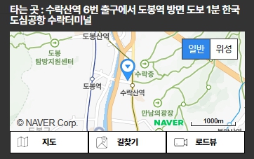 | 수락터미널 | 수락산역 6번 출구에서 도봉역 방면 도보 1분 한국도심공항 수락터미널![]() |