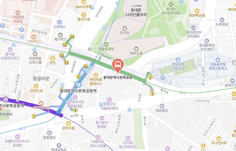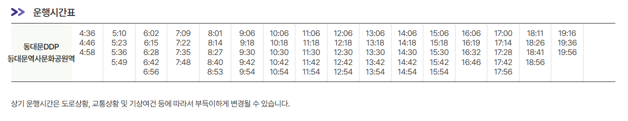 | 동대문DDP, 동대문역사문화공원역 | 동대문역사문화공원역 10번 출구에서 한양공고방면 100미터 지점 나이키 매장 앞 (승하차 위치 동일)![]() |