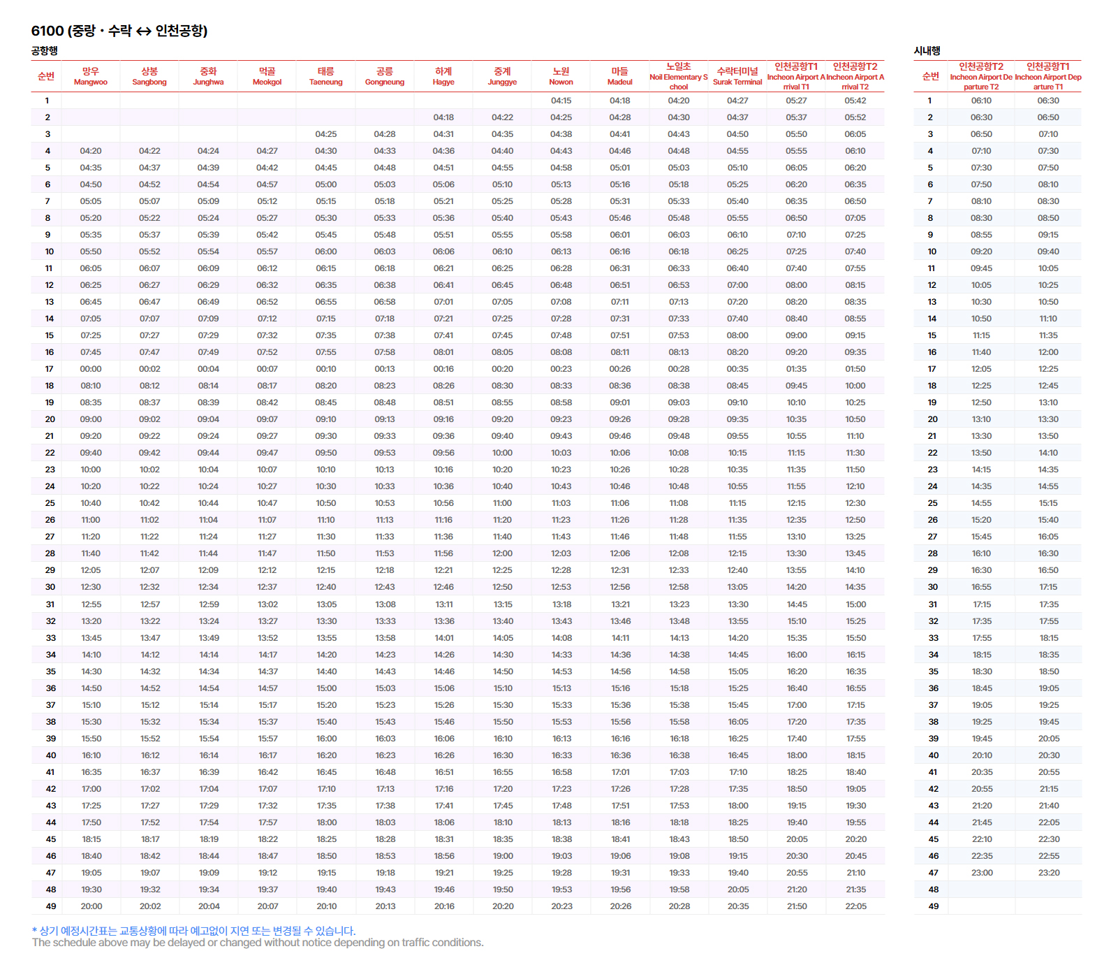 6100번 인천공항 리무진을 타시려는 분들은 반드시 확인해야 할 정보가 있습니다. 25년 5월 19일부터 5월 31일까지 한시적으로 인천공항 6100번 노선 시간표가 변경되기 때문입니다.