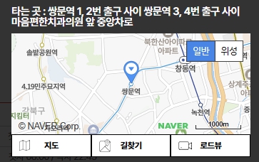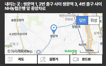 | 쌍문역 | 쌍문역 1,2번 출구 사이 쌍문역 3,4번 출구 사이 마음편한치과의원 앞 중앙차로![]() |