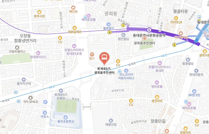 | 퇴계로6가 스카이파크호텔 | CJ푸드월드 앞 시내버스 정류소 공용 (승하차 위치 동일)![]() |