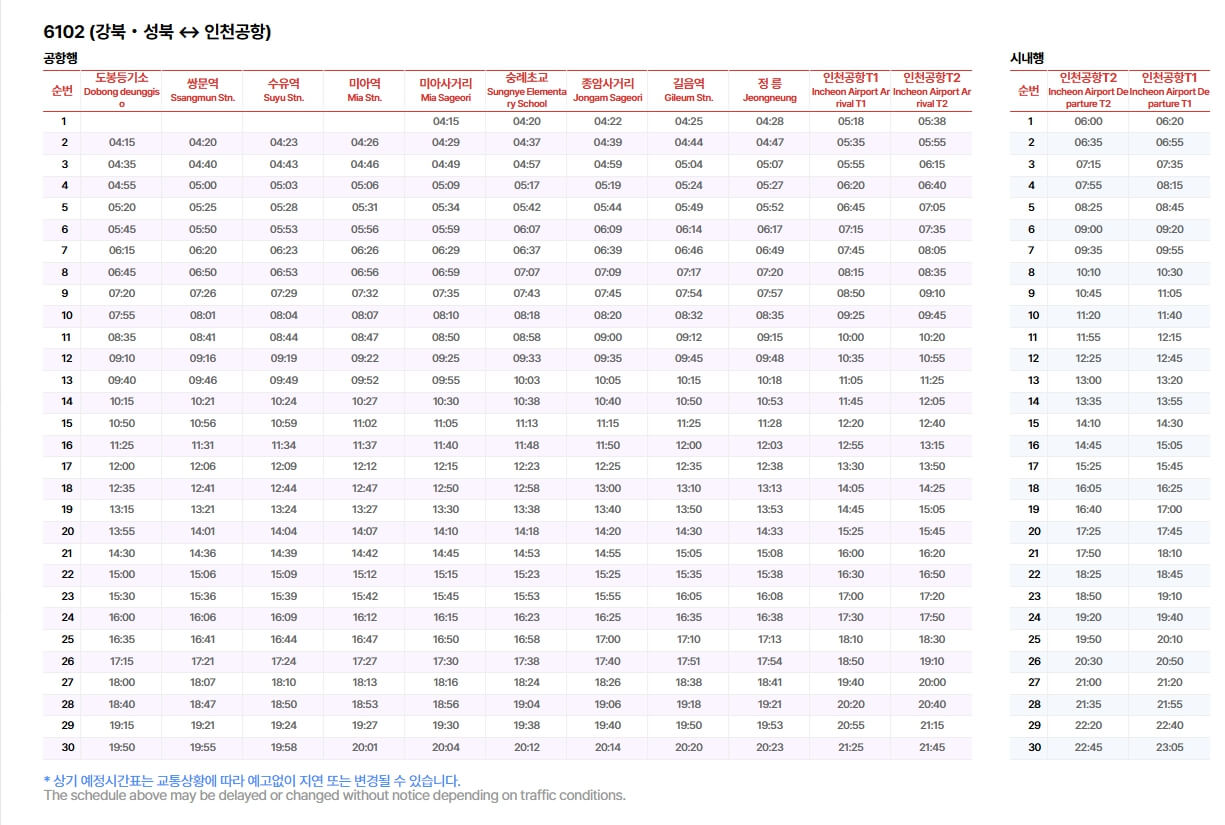 6102번 공항버스 노선, 시간표 정보 (도봉등기소, 쌍문, 수유, 미아, 미아사거리, 숭례초교, 종암경찰서, 길음, 정릉)